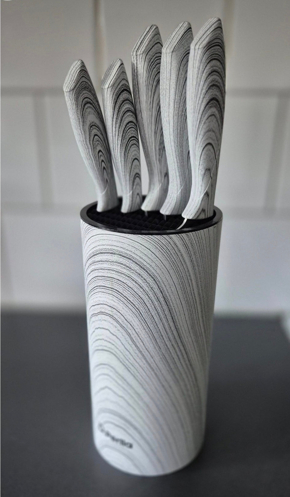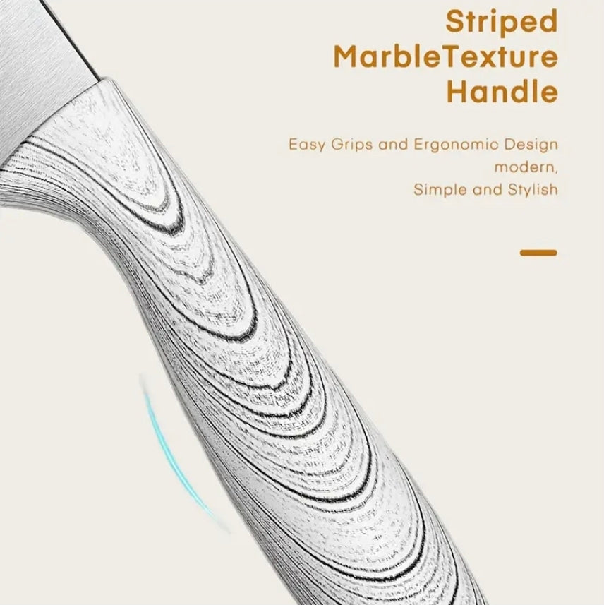 6-delars Kökssknivset med Marmormönstrade Handtag – Komplett Set med Vertikal Cylindrisk Knivhållare