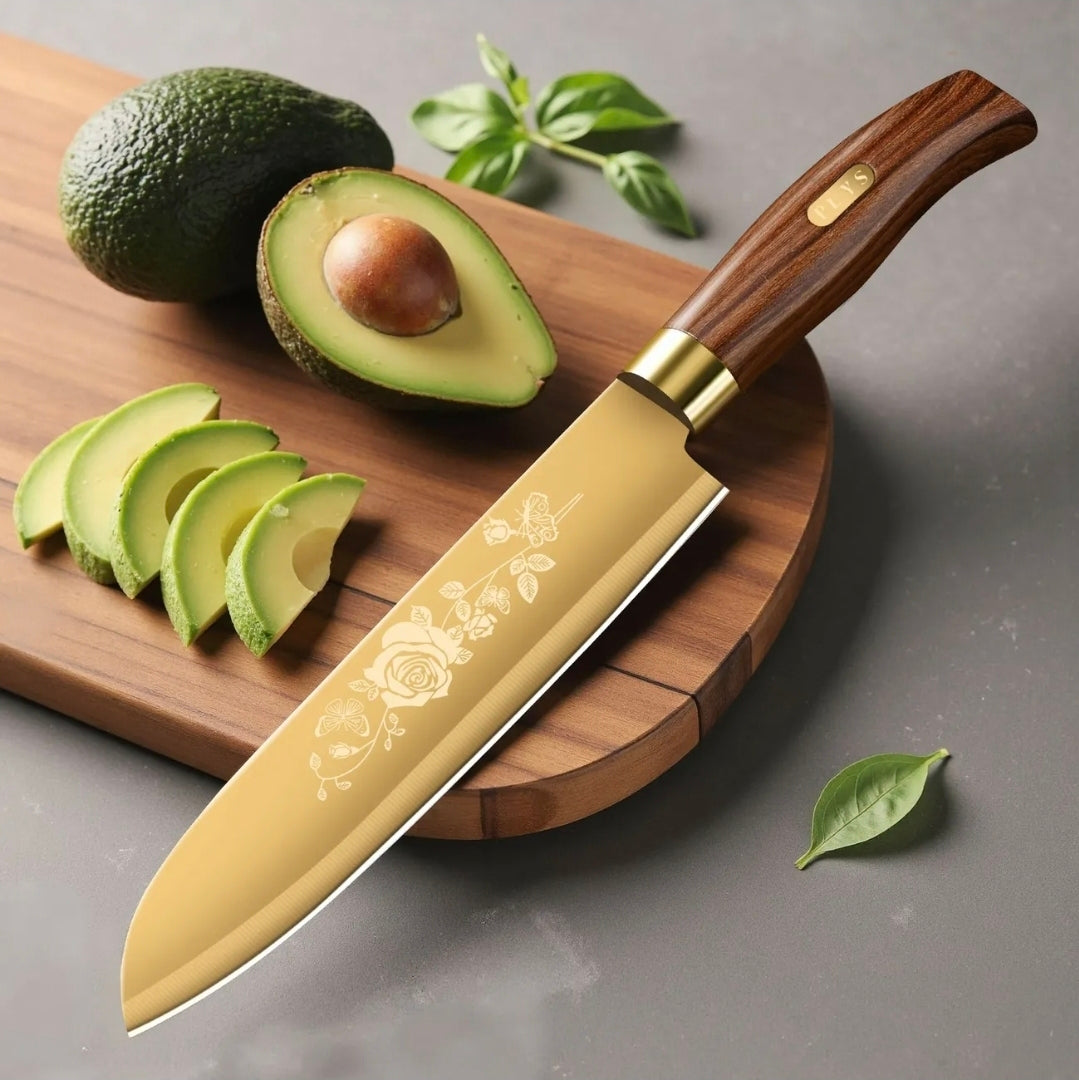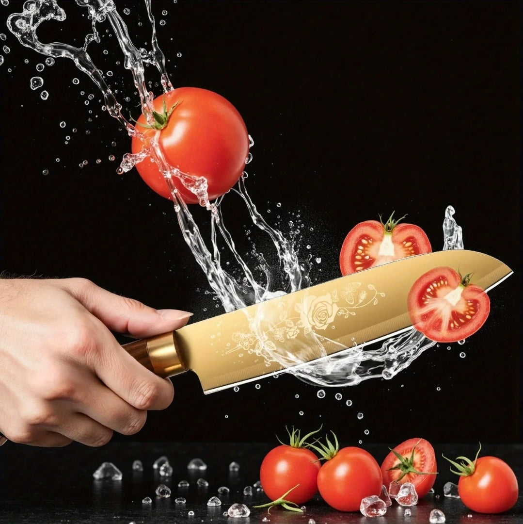 Upptäck en perfekt balans mellan design och funktionalitet. Detta exklusiva knivset i 4 delar är tillverkat av rostfritt stål med gyllene titanbeläggning och dekorerade med eleganta blommönster. Varje kniv är utformad för specifika uppgifter i köket och ger professionell skärpa och hållbarhet – perfekt för både hemmakockar och restaurangmiljöer.